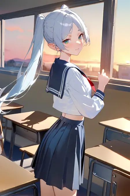 For SD 1.5 model, if you see wrong bangs or hair color, add"silver hair, parted bangs" to correct it. This might happen when "twintails" is not used.