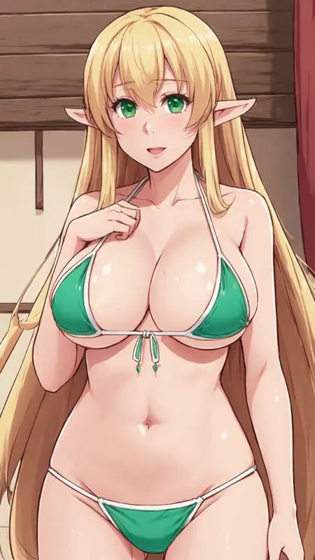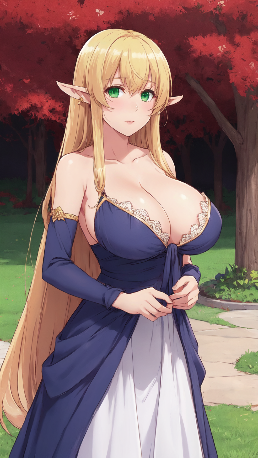 fiona, blonde hair, long hair, green eyes, pointy ears, big breasts, cleavage,