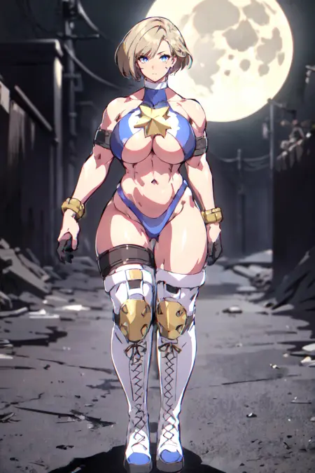 Trigger : 1girl, short hair, armlet, wrestling outfit, halterneck, facial mark, bracelet, knee boots