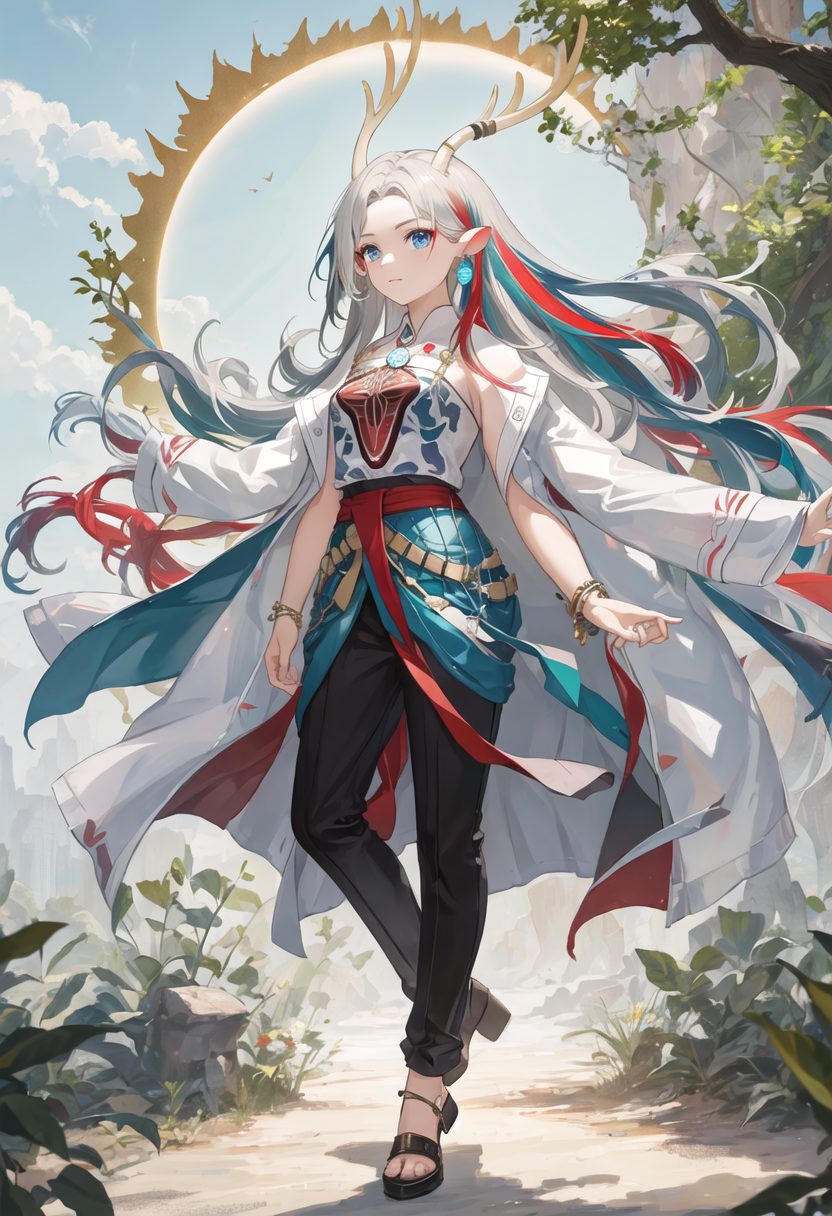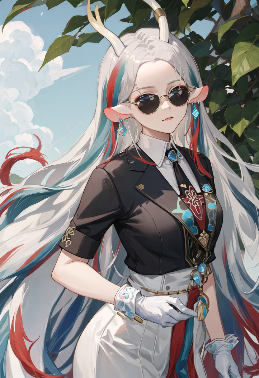 The trigger word is nine_colored_deer_arknights, and the pruned tags are long_hair, multicolored_hair, red_hair, animal_ears, earrings, blue_hair, blue_eyes, deer_ears, very_long_hair, grey_hair, streaked_hair, white_hair. When some features (e.g. hair color) are not so stable at some times, you can add these them into your prompt.
