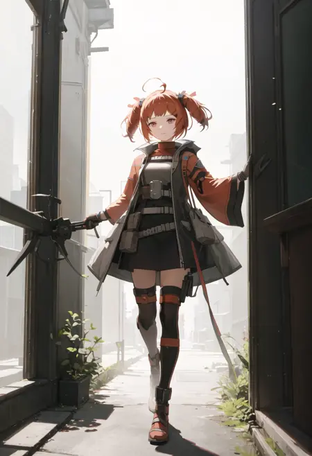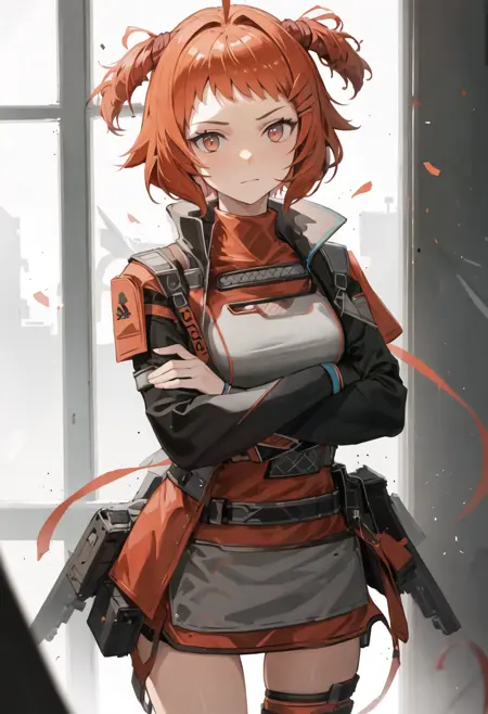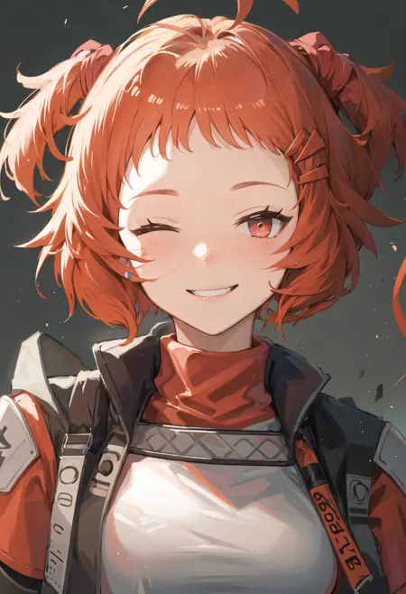 The trigger word is beagle_arknights, and the pruned tags are short_hair, ahoge, glasses, hair_ornament, orange_hair, semi-rimless_eyewear, under-rim_eyewear, red-framed_eyewear, red_eyes, hairclip. When some features (e.g. hair color) are not so stable at some times, you can add these them into your prompt.