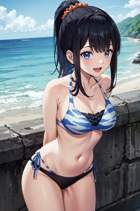 - ccrikka,long hair,hair scrunchie,ponytail,bangs,swimsuit,black bikini,layered bikini,tiger print,mismatched bikini,side-tie bikini bottom