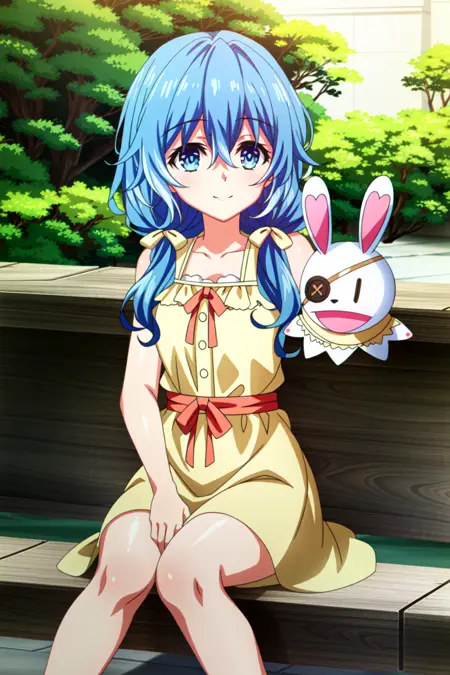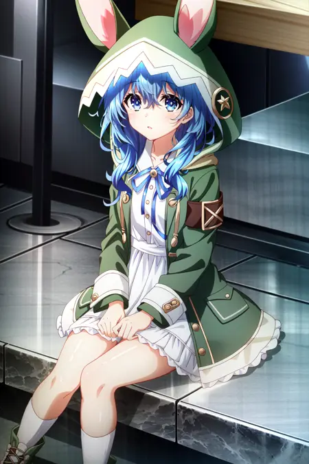 Yoshino Himekawa, 1girl, hood, blue hair, animal hood, long hair, blue eyes, animal ears, looking at viewer, puppet, solo, rabbit ears, hand puppet, hair between eyes, long sleeves, upper body, rabbit hood, eyepatch, stuffed bunny, bangs, hood up, open clothes, white dress, dress, coat, stuffed toy, ribbon