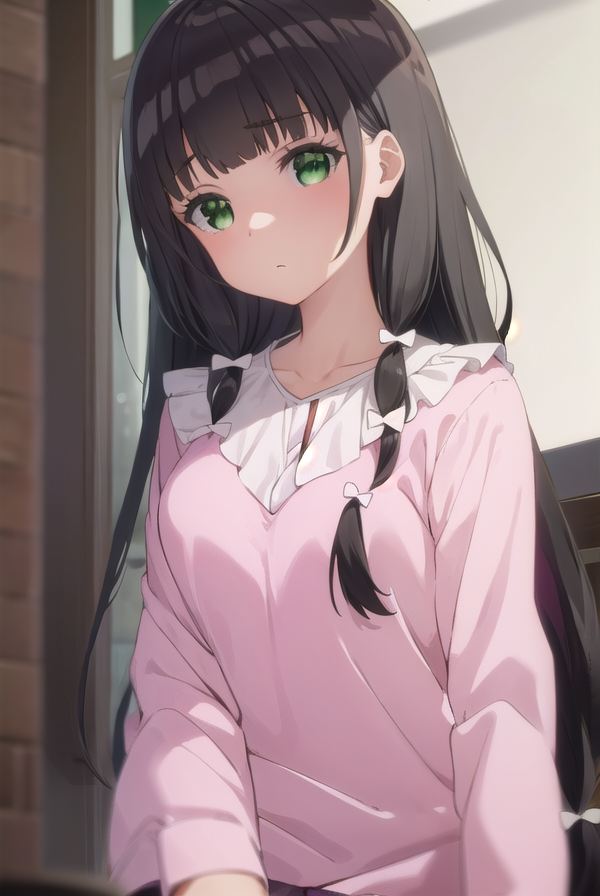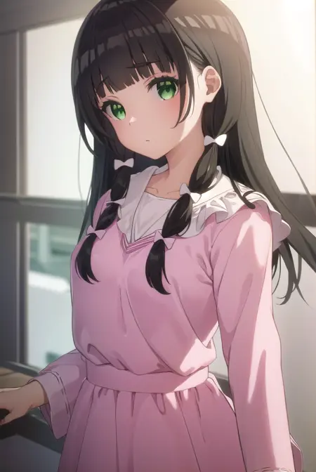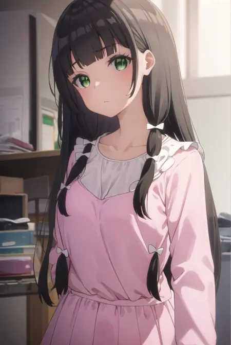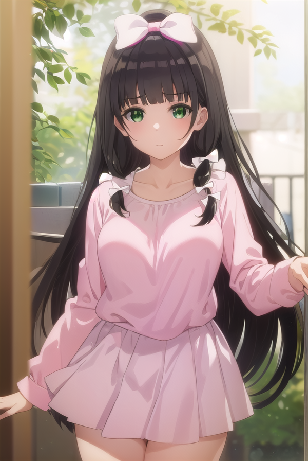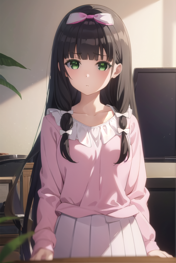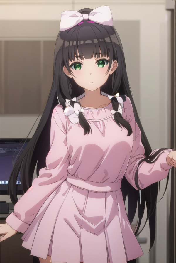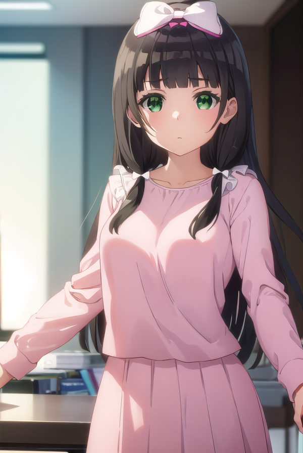 kaiko mikuniyama, long hair, bangs, black hair, bow, (green eyes:1.3), hair bow, blunt bangs, white bow, pink bow,
