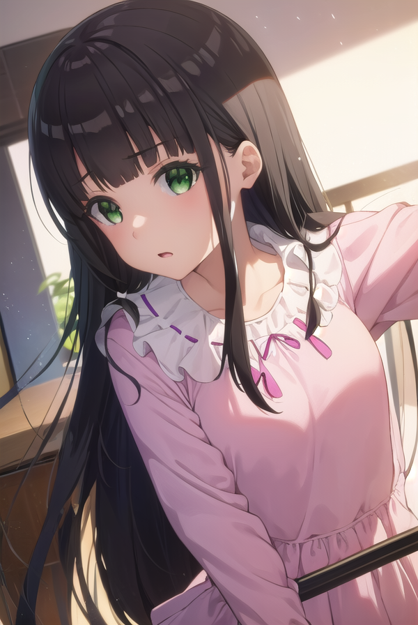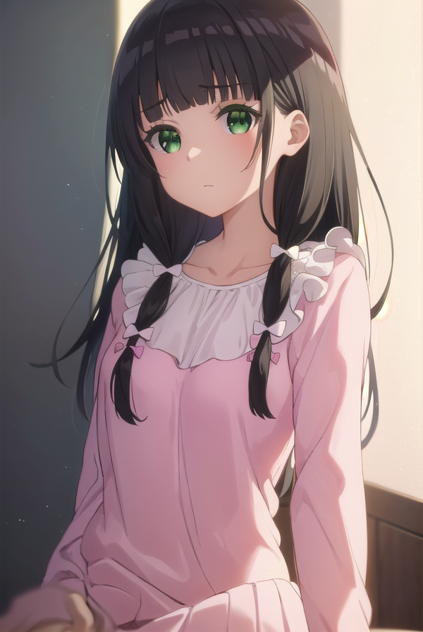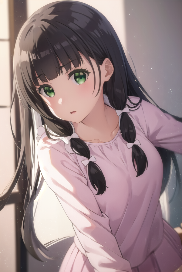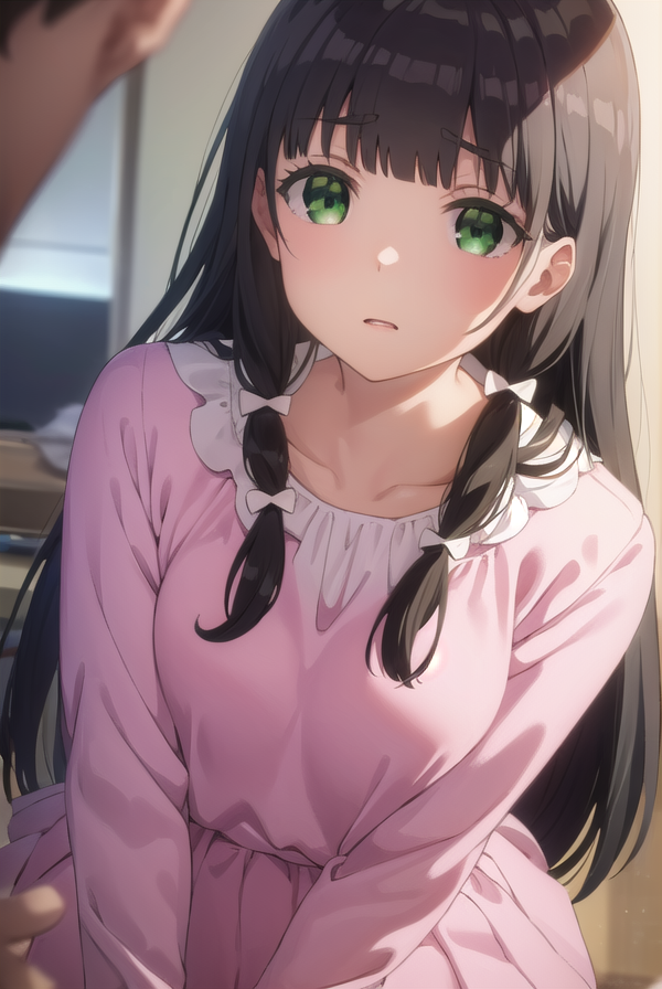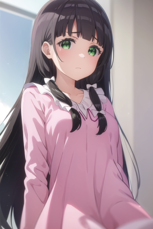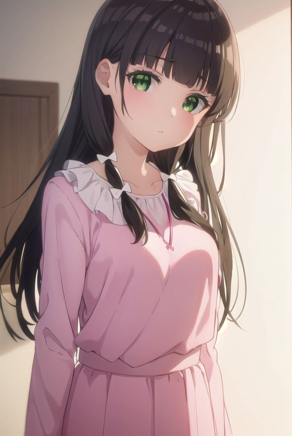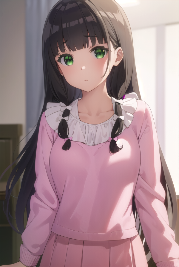 kaiko mikuniyama, long hair, bangs, black hair, bow, (green eyes:1.3), hair bow, blunt bangs, white bow, pink bow,