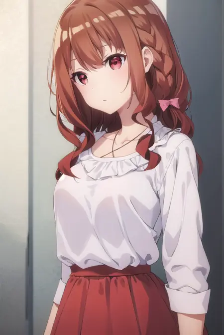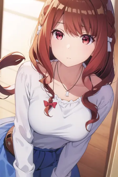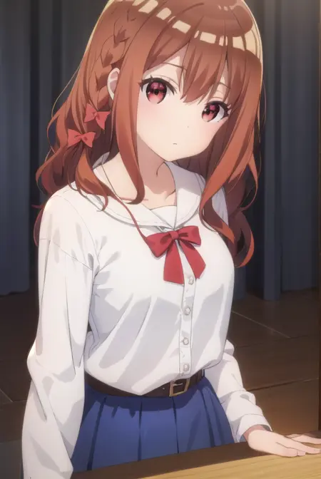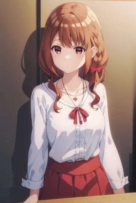 miyako shirakawa, long hair, bow, brown hair, (red eyes:1.3), braid, hair bow, wavy hair,