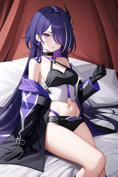 huangquan,long hair,purple hair,purple eyes,hair over one eye,navel,gloves,hair ornament,black gloves,bare shoulders,choker,trench coat,midriff,crop top,single thighhigh,