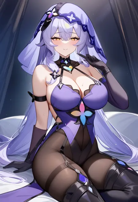 heitiane,a girl named heitiane,1girl,veil,bare shoulders,elbow gloves,purple dress,black gloves,sleeveless dress,pantyhose,thigh boots,