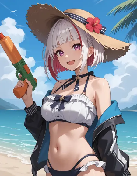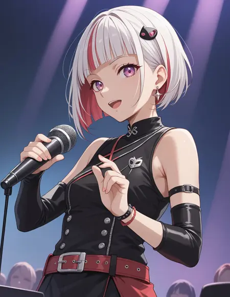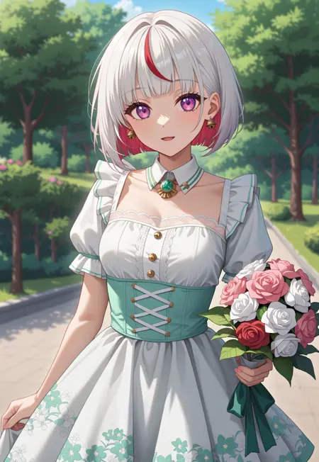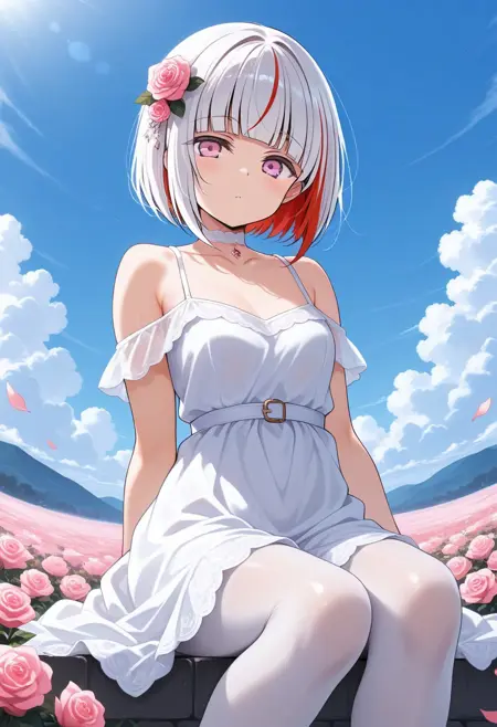 bangs, blunt bangs, short hair, white hair, bob cut, pink eyes, purple eyes, red hair, multicolored hair, streaked hair, tsuzuri