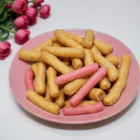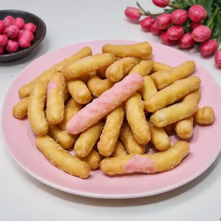 The traditional snack 'Cun Zao' is only available during the Lunar New Year. Also known as 'Date Branch', its name has various origins, one being that it resembles a one-inch date tree branch. Made from fried flour, it's chewy and crispy. 'Eating Cun Zao, good year after year' is an auspicious phrase said by the older generation when eating Cun Zao. Coating it with powdered sugar also represents 'eating sweet, having a good New Year', symbolizing a wish for smooth sailing.
