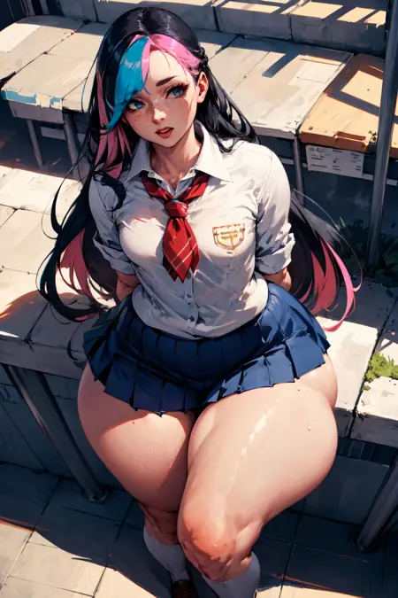 黑色、青色和粉红色的头发,蓝色的眼睛,下半身丰满。