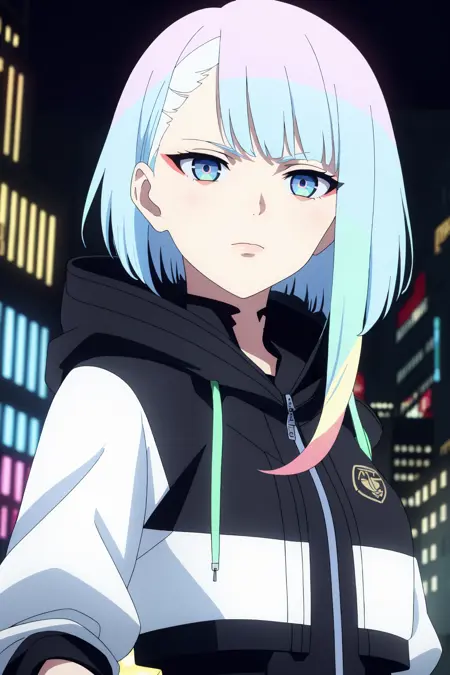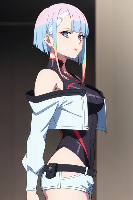 leotard, short hair, jacket, highleg leotard, off-shoulder jacket, highleg leotard, shorts, bodysuit, open jacket, cropped jacket, long sleeves, open clothes