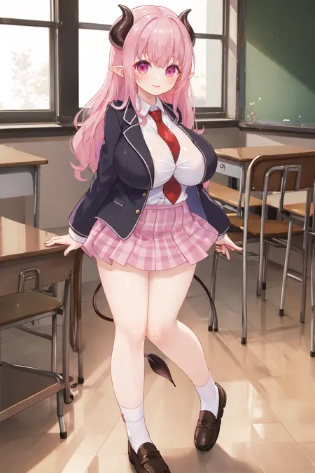 school uniform, open jacket, blazer, pink skirt, red necktie, necktie between breast, black socks, loafers, mary janes, plaid skirt