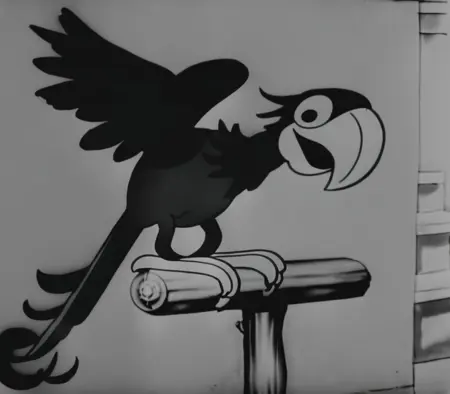 1920s animation, parrot on stand looking down closeup, spread wings, stairs, solo, bird, animal focus