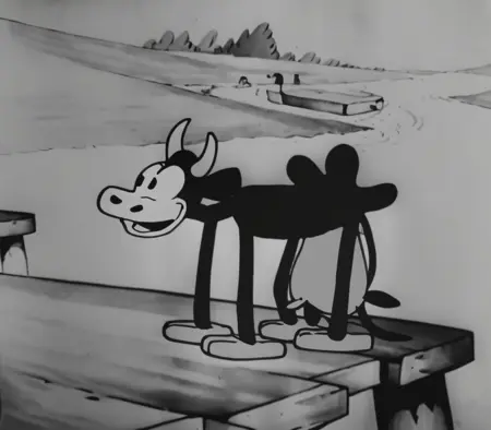 1920s animation, open mouth, skinny cow focus on pier, cow tail straight up, nature, scenery in the background