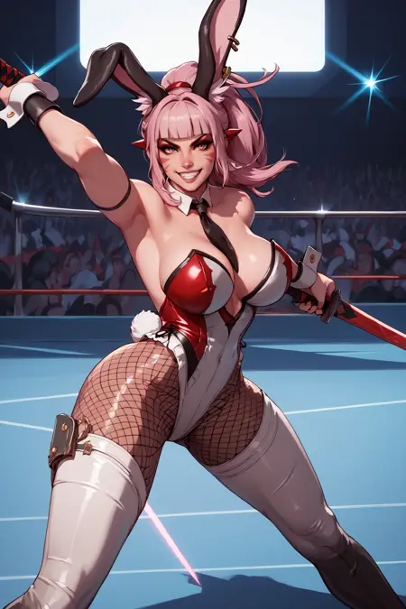 Trigger BladeBunny : 1girl,bladebunny,long hair,bangs,rabbit ears,animal ear fluff,facial mark,sword,holding sword,wrist cuffs,bowtie,single glove,thighhighs,strapless leotard,boots,fishnet pantyhose,dual wield,rabbit tail