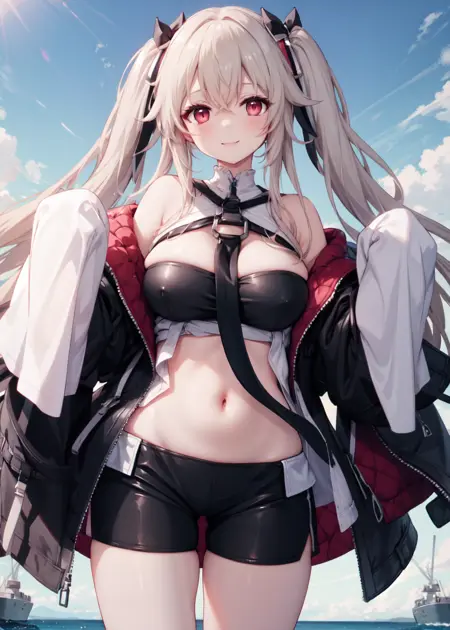 原版(origen):anchorage_\(azur lane\),twintails,red eyes,shorts, off shoulder, long_sleeves,sleeves past wrists, coat,