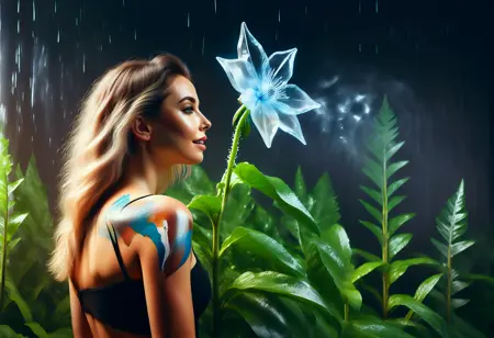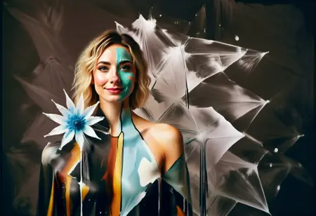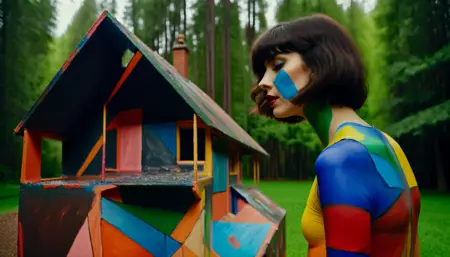 "Woman painted in (Gotye-feat-Kimbra-Somebody style:0.6), (blue|red|yellow) tight pigtail freckled hair, smile, happy,from behind"