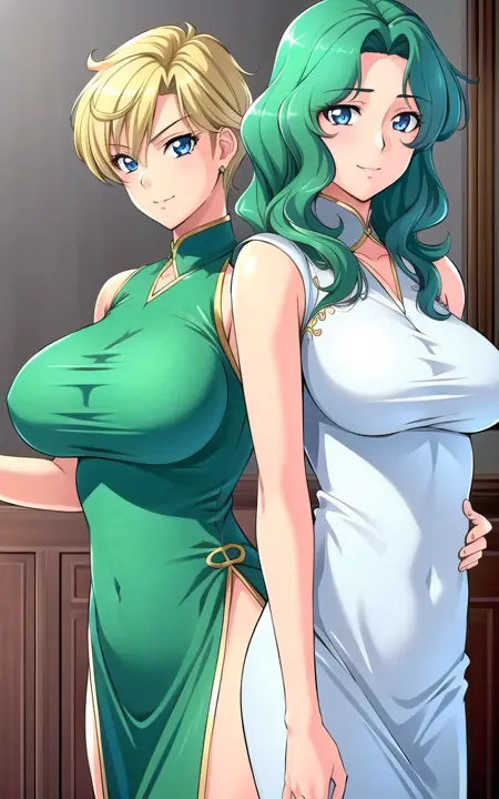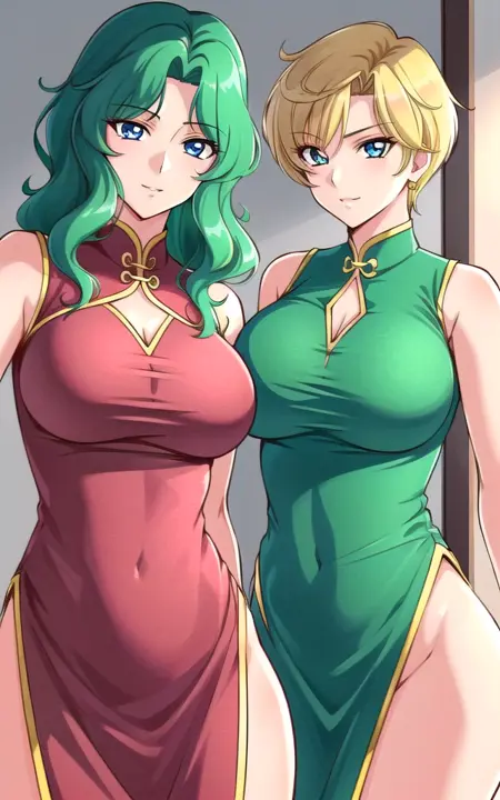 lora:HaruMichi:0.45, KaiouMichiru, TenouHaruka, 2girls, big_breasts, NeptuneTiara, NeptuneSailorCollar, NeptuneChoker, NeptuneGloves, NeptuneSenshiUniform, NeptuneSkirt, NeptuneSenshiUniform, NeptuneTiara, NeptuneBow, NeptuneChoker, NeptuneHighHeels, NeptuneBackBow, NeptuneBackBow, NeptuneSkirt, UranusSailorCollar, UranusSenshiUniform, UranusBow, UranusChoker, UranusTiara, UranusSenshiCollar, UranusGloves, UranusSkirt, Uranus_shoes, UranusShoes, UranusBackbow, UranusGloves,