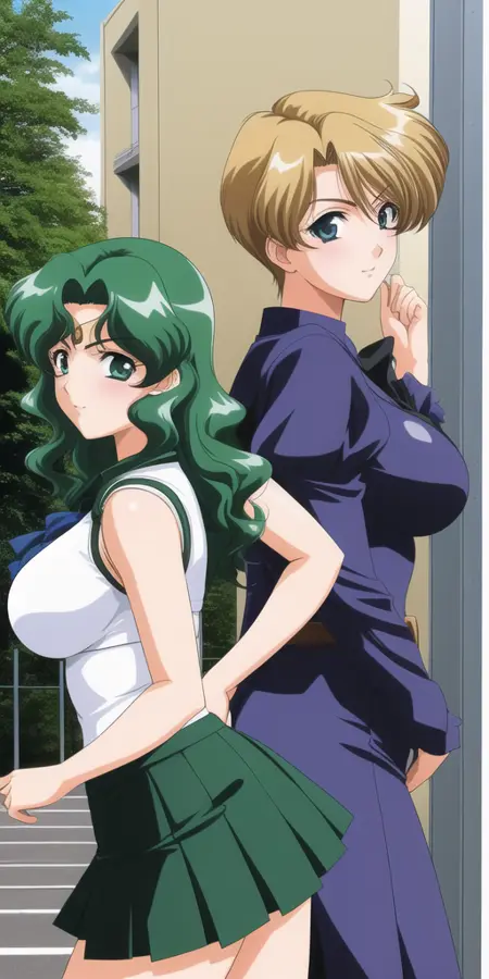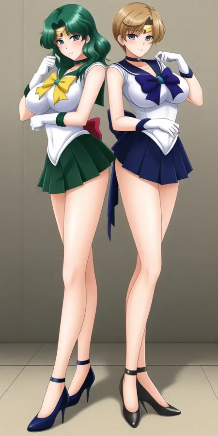 lora:HaruMichi:0.45, KaiouMichiru, TenouHaruka, 2girls, big_breasts, NeptuneTiara, NeptuneSailorCollar, NeptuneChoker, NeptuneGloves, NeptuneSenshiUniform, NeptuneSkirt, NeptuneSenshiUniform, NeptuneTiara, NeptuneBow, NeptuneChoker, NeptuneHighHeels, NeptuneBackBow, NeptuneBackBow, NeptuneSkirt, UranusSailorCollar, UranusSenshiUniform, UranusBow, UranusChoker, UranusTiara, UranusSenshiCollar, UranusGloves, UranusSkirt, Uranus_shoes, UranusShoes, UranusBackbow, UranusGloves,