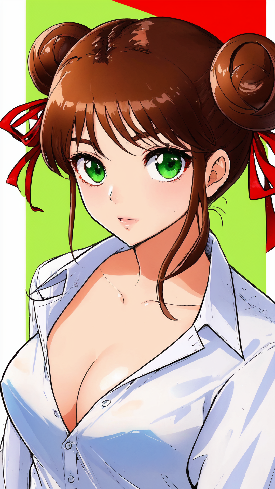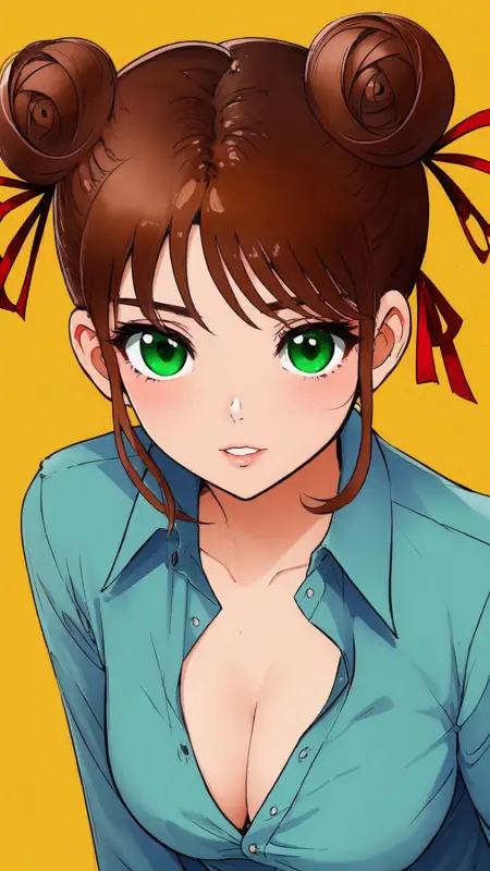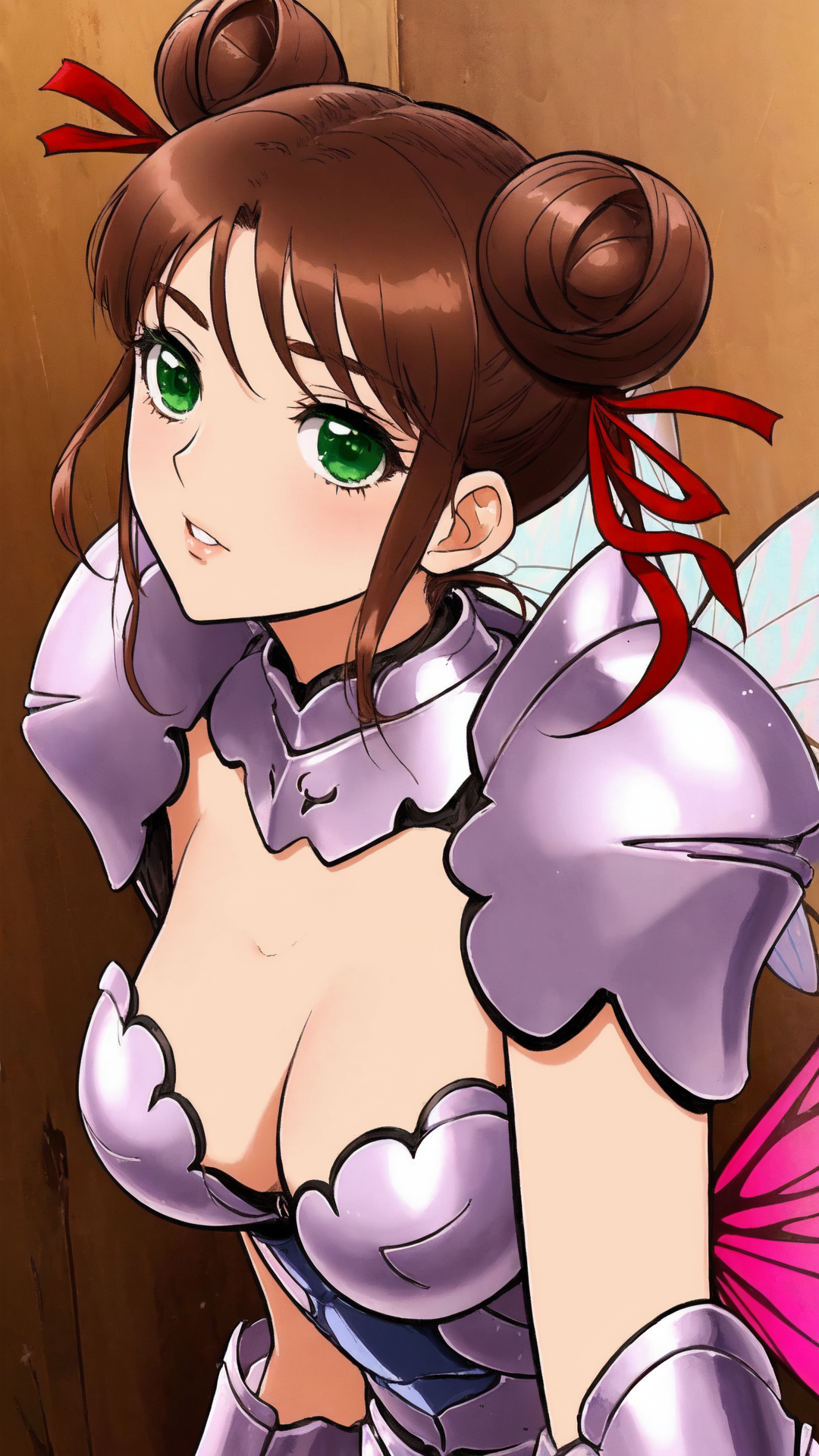 shirin, Brown Hair, Short Hair, Twin Hair Buns, red ribbon on hair buns, Green Eyes, Big Breasts, cleavage, pink armor, fairy wings,