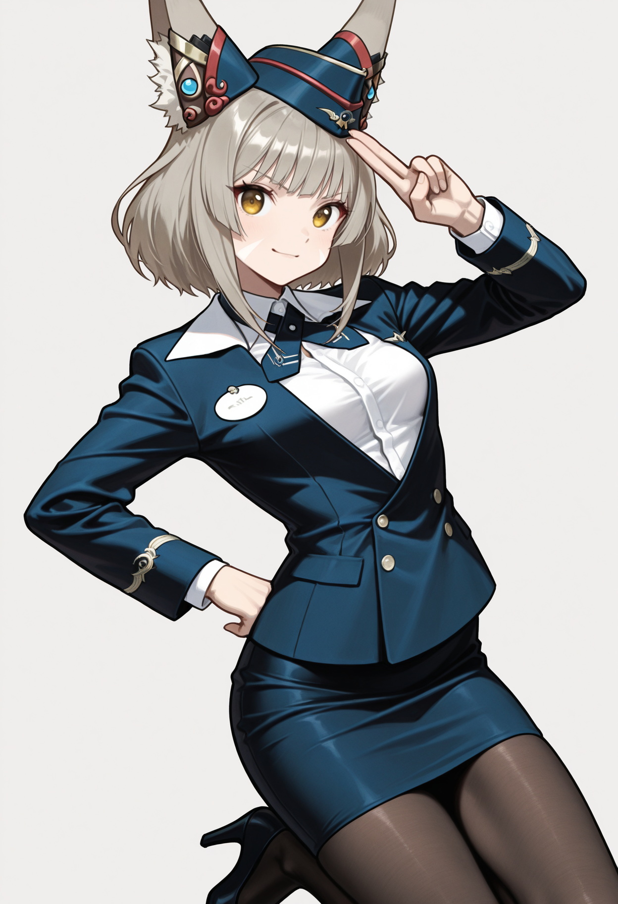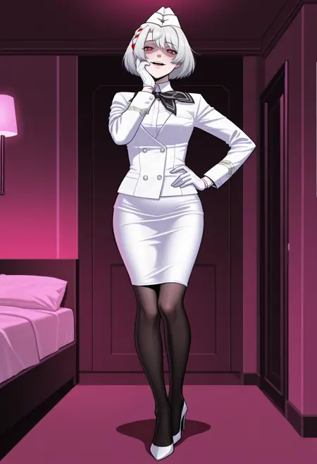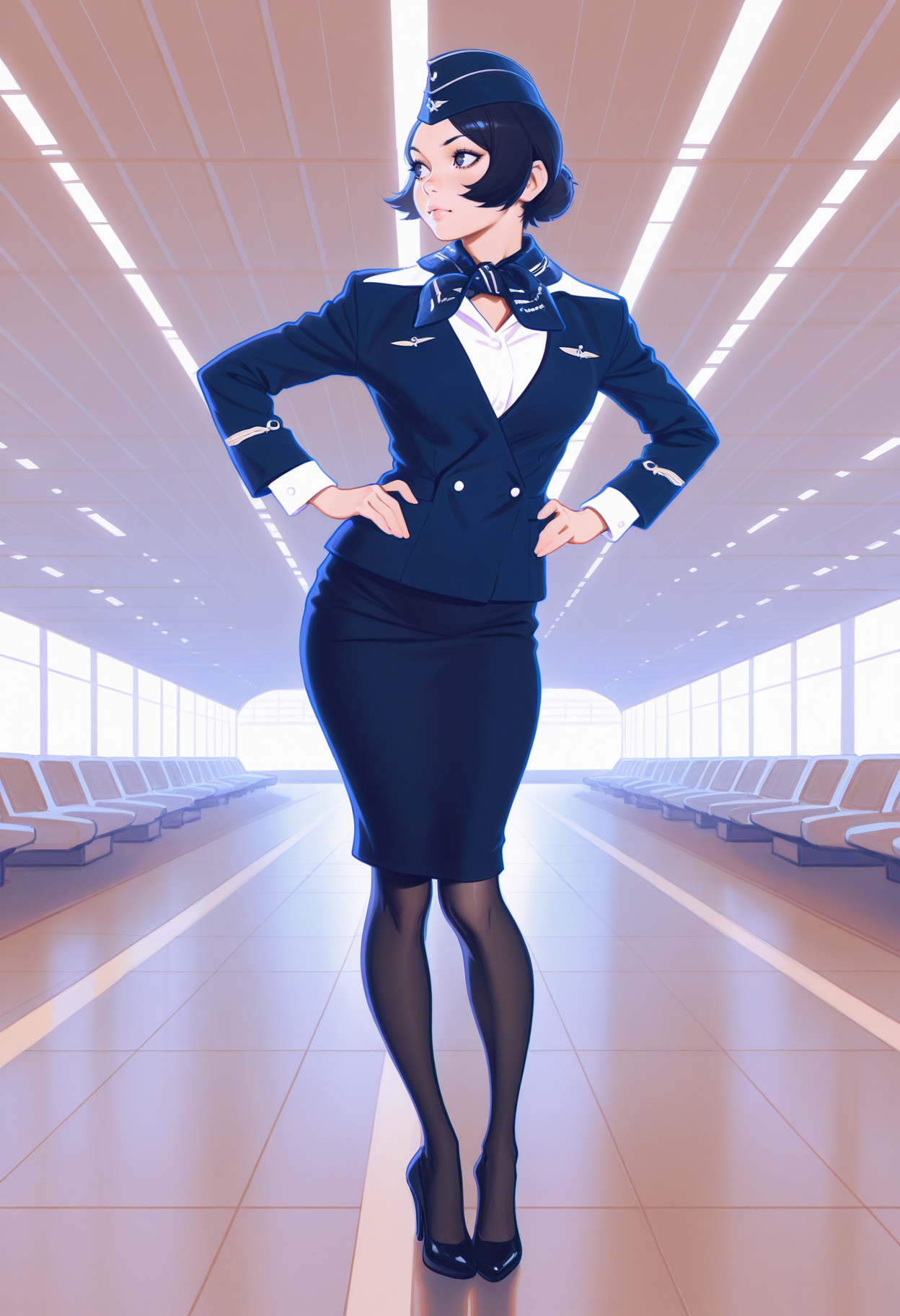 Invoke with st3w4rd3ss, uniform, white gloves, lapel, garrison cap, flight in, name tag, pencil skirt, scarf, cuffs, hourglass figure
