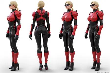 "This image is a CGI multiple view of a cybernetic man, wearing a red armor, futuristic style, in four different angles, front view, back view and side views. She's wearing a helmet suit, with neon visor shining.