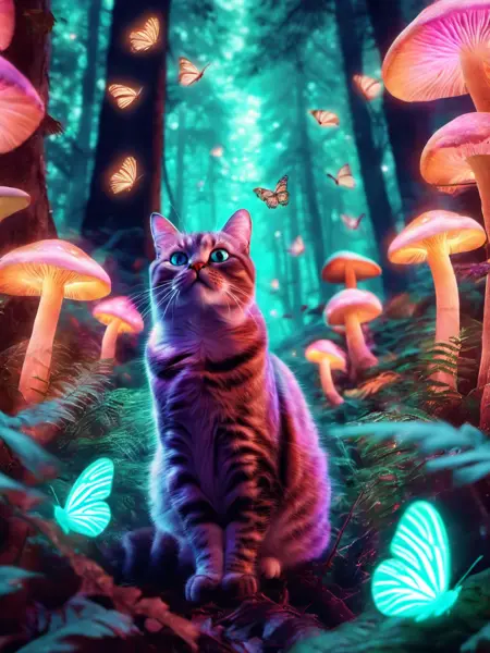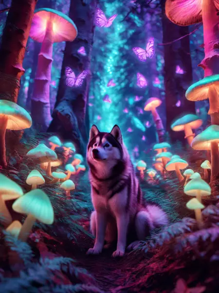 Prompt: Pet portrait of {desired breed} in a glowing forest with glowing mushrooms and glowing butterflies