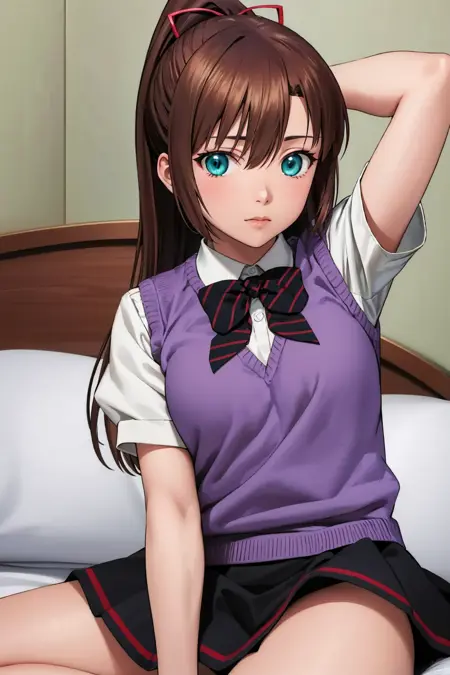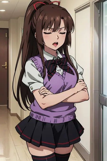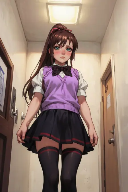 그녀의 전형적인 외모를 위해 "헤어 리본, 버터플라이 넥타이, 흰 셔츠, 보라색 스웨터 조끼, 단팔, 주름치마, 검은 허벅지 양말"을 추가하세요.