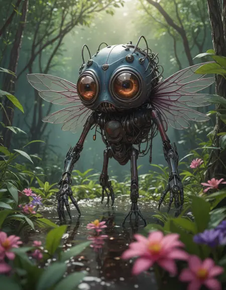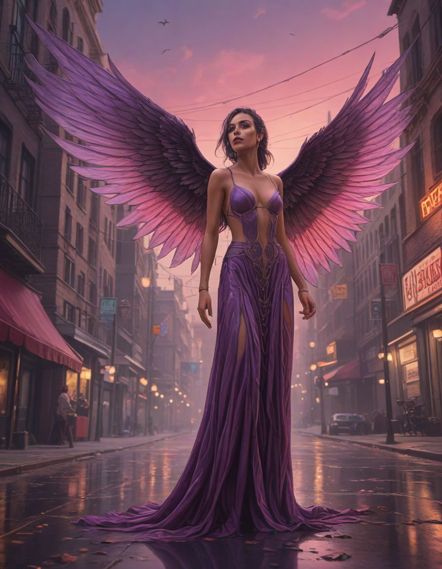 Merge 7 sliders with trigger Bizarrely, Glorious, Giant robot looming, very upset, Mystical being with iridescent wings, a delicate smoky veil, hands reaching out for a hug . A unique style. Examples at 0.7-1 strength.