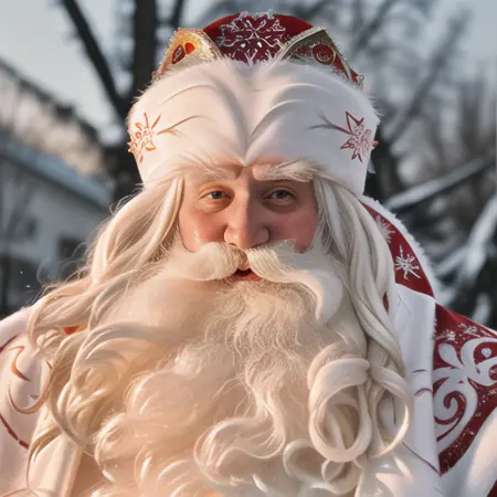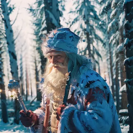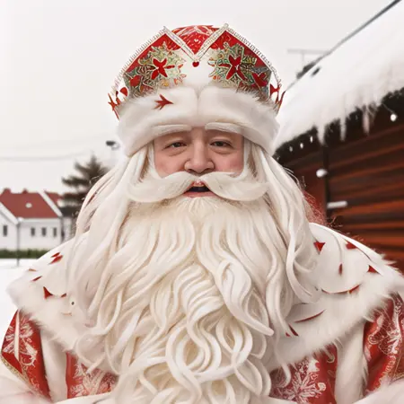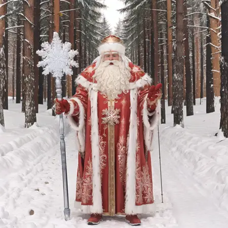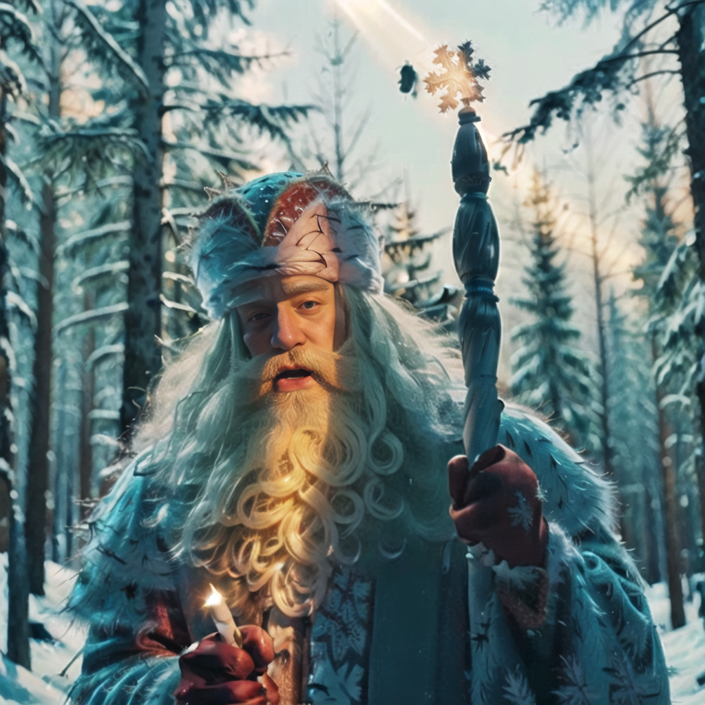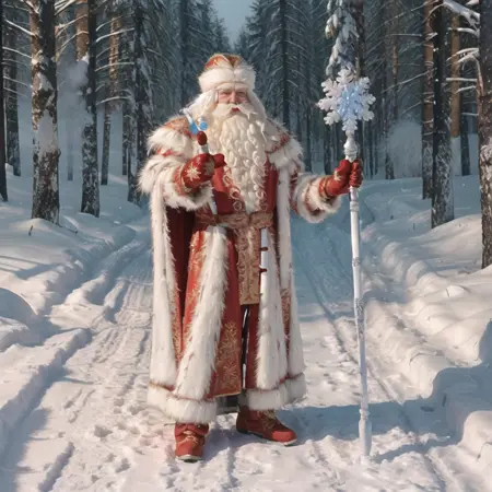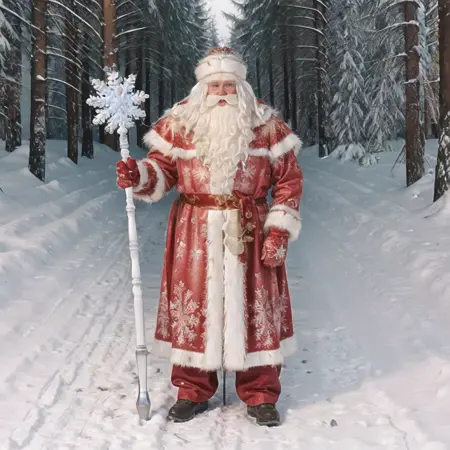 "Дедушка Мороз" ("Ded Moroz" or "Dedushka Moroz", "Grandpa Frost") is a Russian fantasy character, aka "Santa Claus". He is wearing a custom hat, also known as Bayarskaya Hat, and caring his magic stuff with a snowflake on top of it.