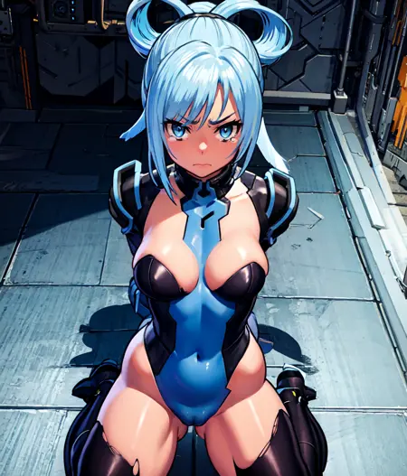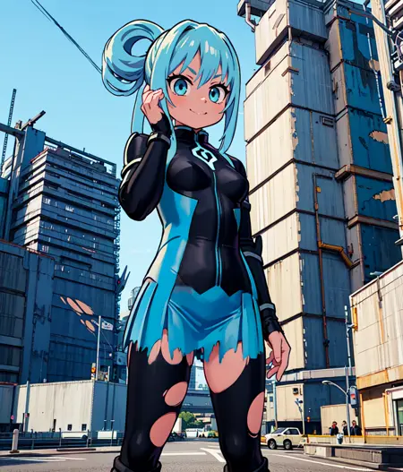 显著标签:长发、发髻、散发、蓝发、蓝眼、蓝黑紧身衣、黑色高筒靴、破烂衣物