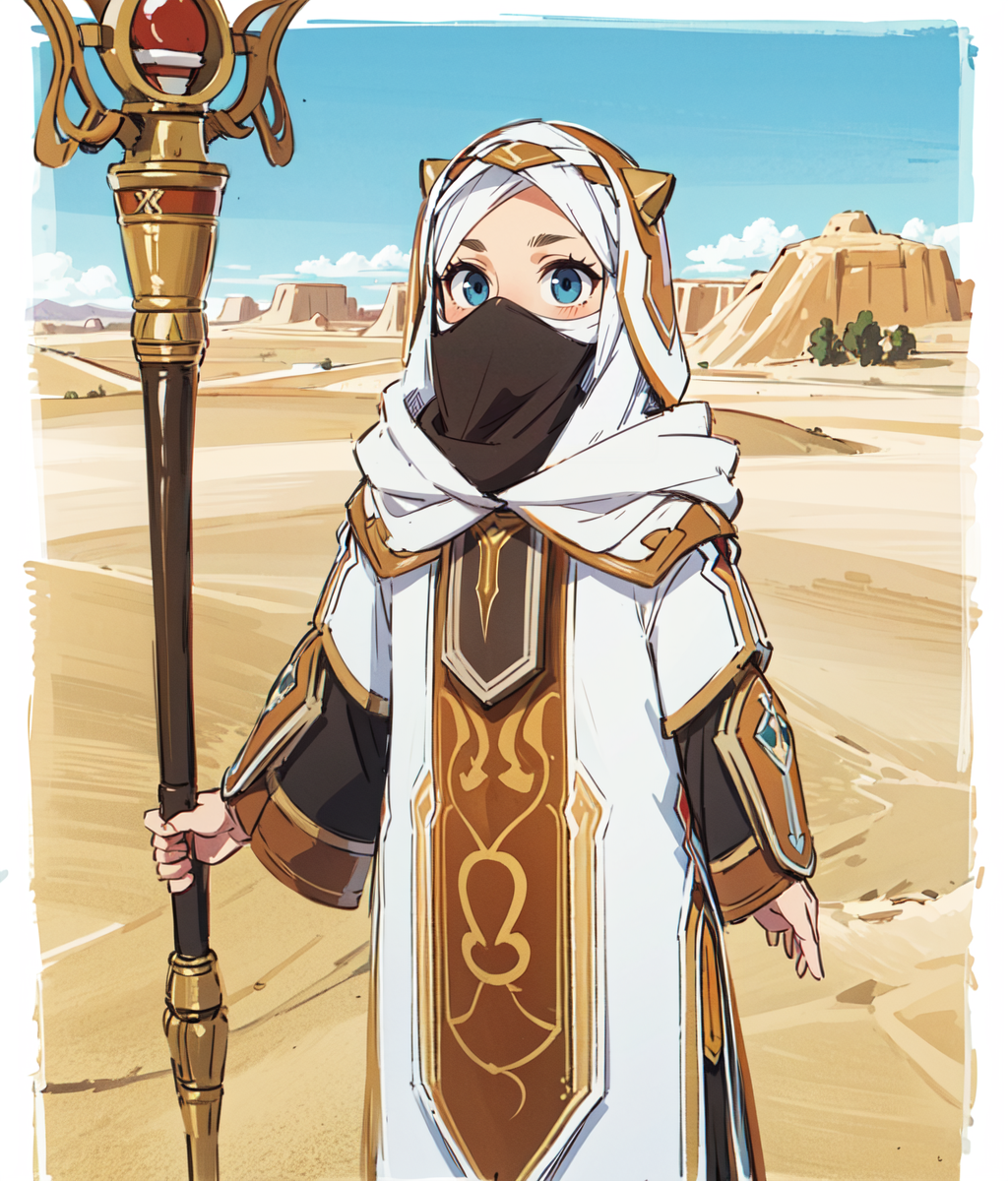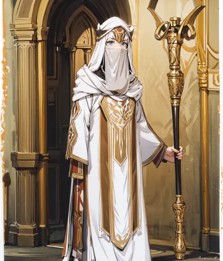 Notable tags: white tunic, white hood, veil covering the face, staff, blue eyes