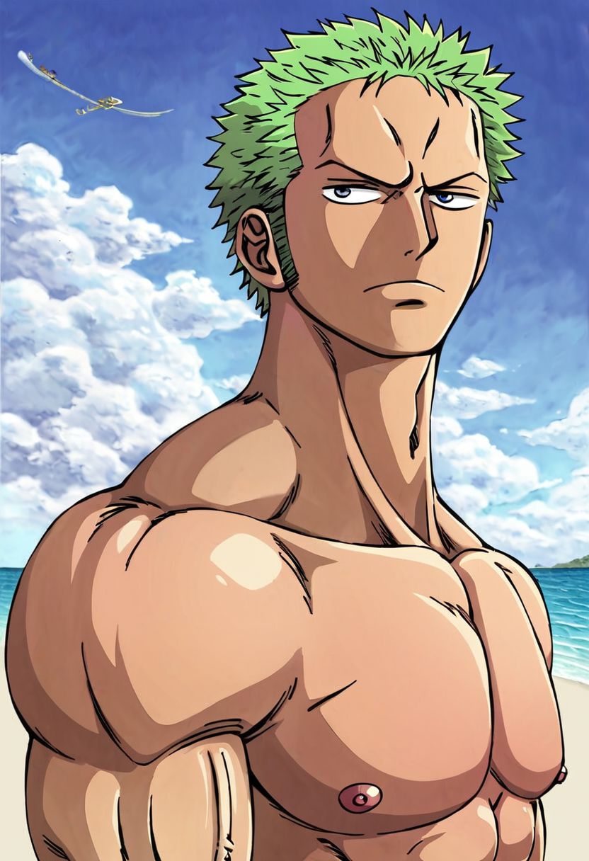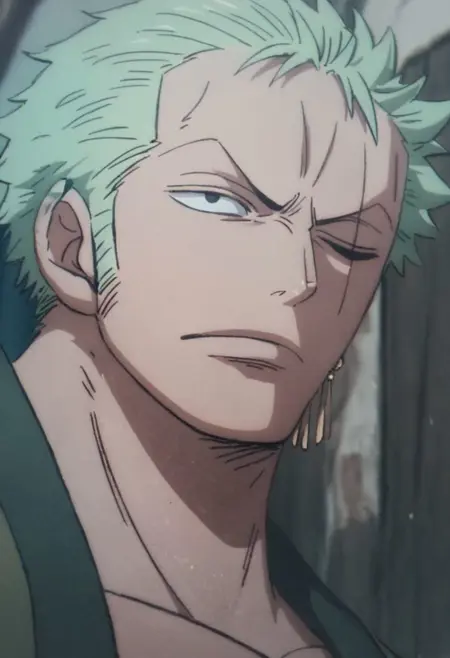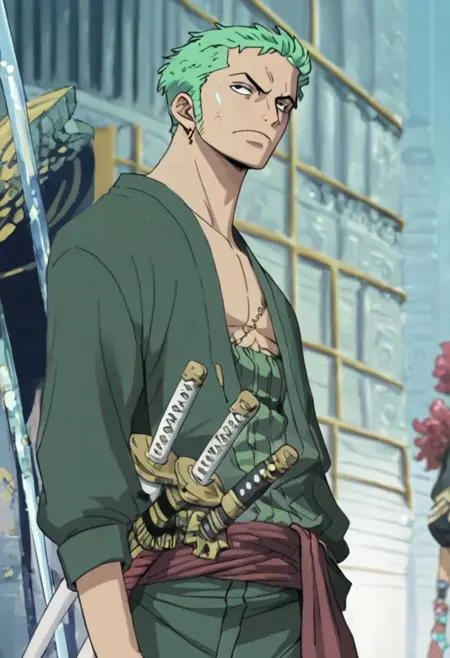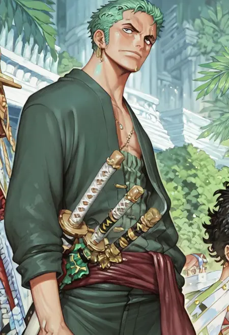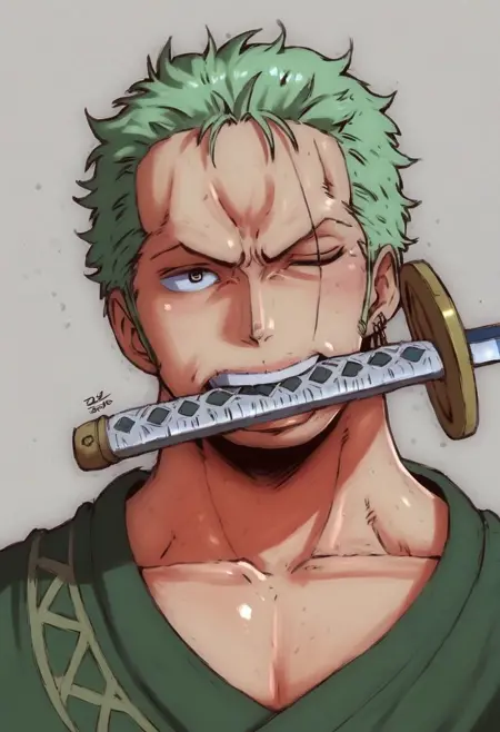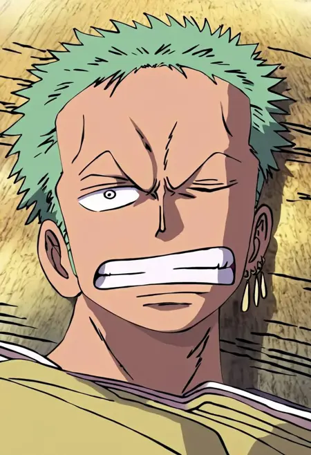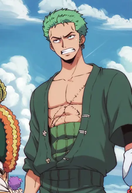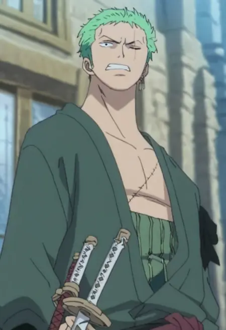 Chouse : First old desing ,Old desing bandana,Sword in mouth, Green clothes, Yellow, Blood, Alabasta,Arlong park, nude chest, Surprised, Ungry, Smile, Sad, Wano clothes, Atack, Bandana