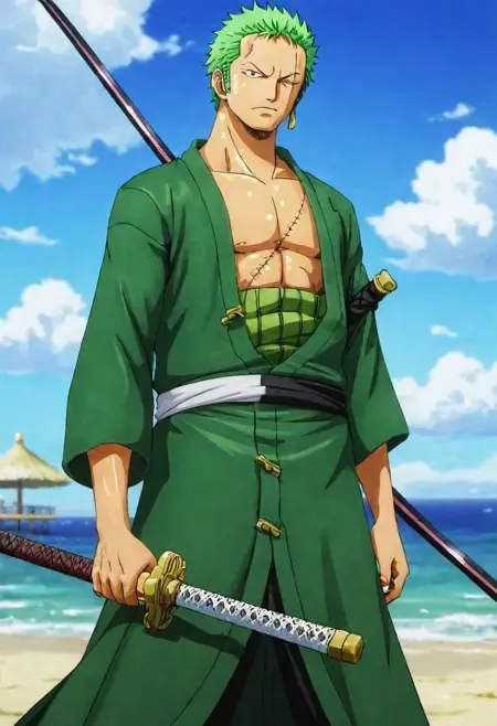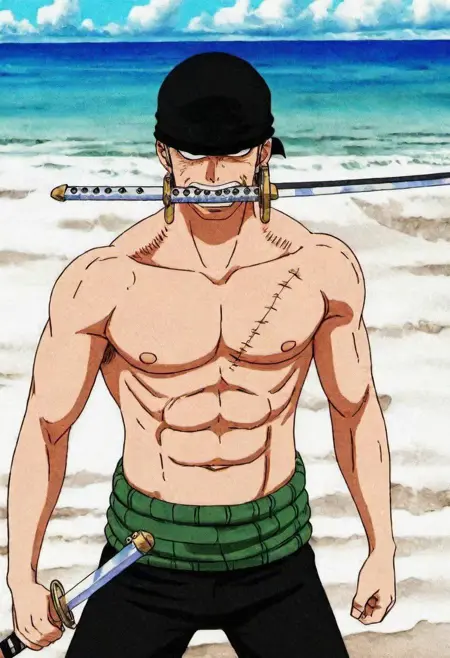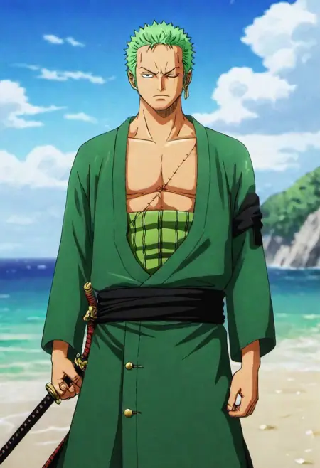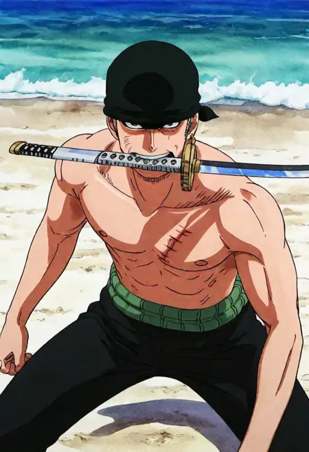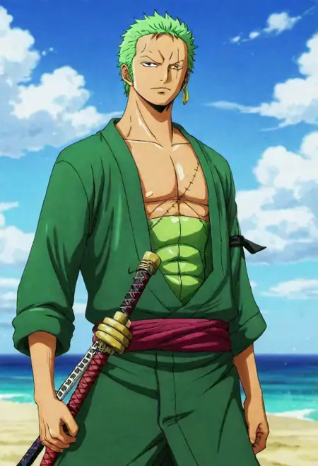 Chouse : First old desing ,Old desing bandana,Sword in mouth, Green clothes, Yellow, Blood, Alabasta,Arlong park, nude chest, Surprised, Ungry, Smile, Sad, Wano clothes, Atack, Bandana