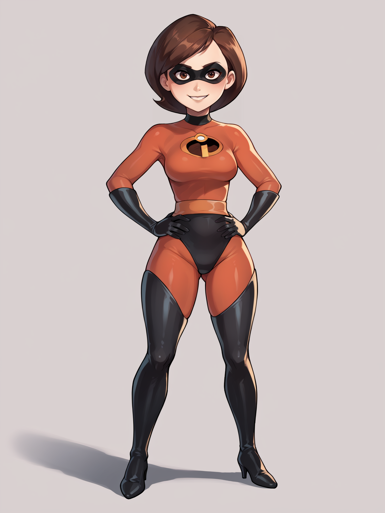 Outfit prompts : domino mask, mask, bodysuit, black elbow gloves, thighhighs, thigh boots