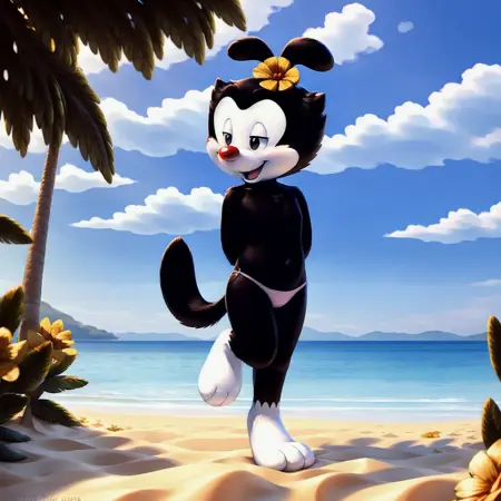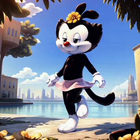표준 토큰: dotw, girl, black body, black head, white cheeks, white legs, black ears, mouth open, black tail, white eyelids, black eyes, Red nose, white gloves, yellow flower on head, pink elastic band on ears, pink skirt