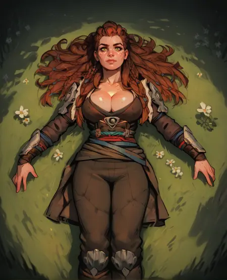 aloy, 녹색 눈 또는 녹색 동공, - 갈색 또는 짙은 빨간색 머리카락, - 긴 머리, 땋은 머리