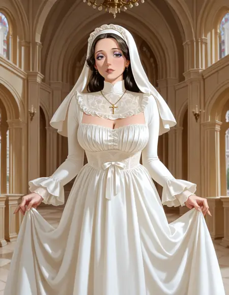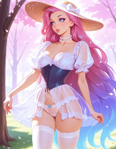For the real cotton/tulle loose fabric, realism is a better angle, so semireal like 2dn Pony or PonyRealism will yield more "Cottage" vibes. Default Pony is pretty flat on fabrics like that.