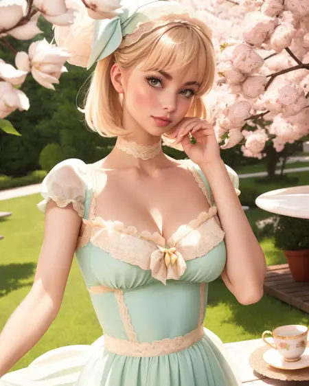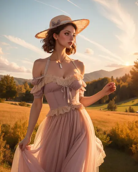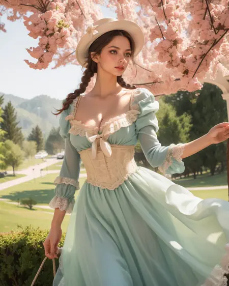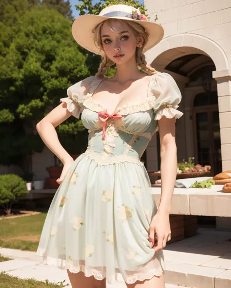 Prompt with c0tt4g3, (cincher), sun hat, floral print, lace, bow, short puffy sleeves,