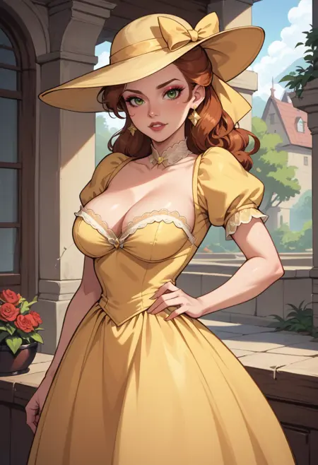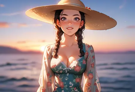 프롬프트: c0tt4g3, (시스너), 햇빛 모자, 플로럴 프린트, 레이스, 리본, 짧고 풍성한 소매