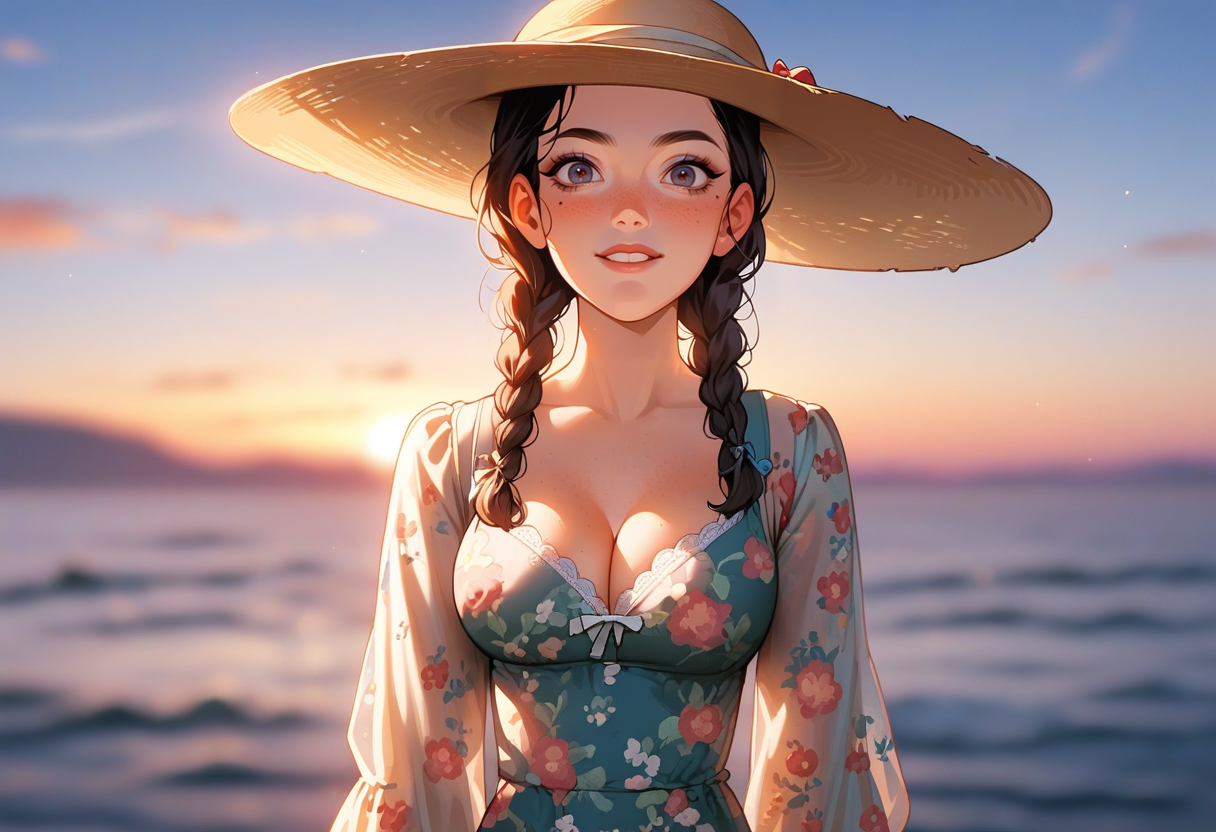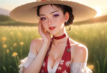 Prompt with c0tt4g3, (cincher), sun hat, floral print, lace, bow, short puffy sleeves,