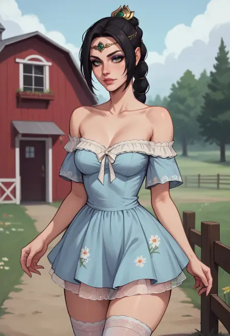 For the real cotton/tulle loose fabric, realism is a better angle, so semireal like 2dn Pony or PonyRealism will yield more "Cottage" vibes. Default Pony is pretty flat on fabrics like that.