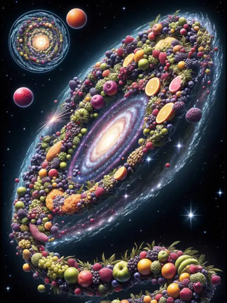 私のLoRAは、輝くフルーツとネオンアウトラインを持つフルーツスタイルを生成します。