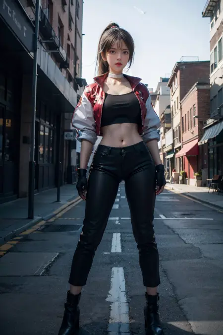 ((white choker,white sleeves)),ponytail,boots,fingerless gloves,(black crop top),pants,black pants,belt,red jacket,