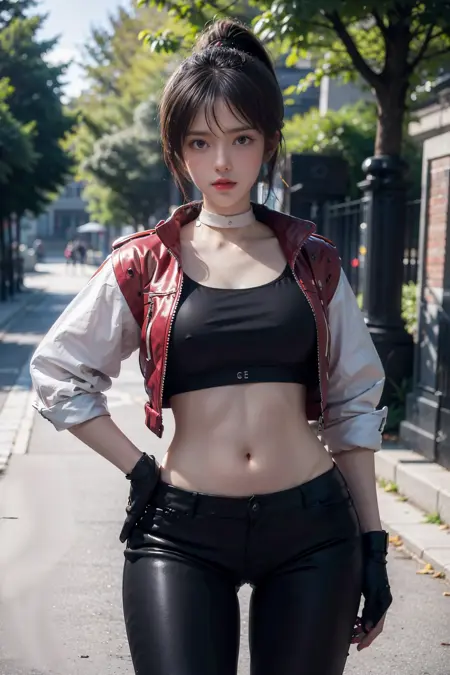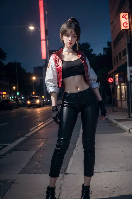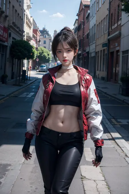 ((white choker,white sleeves)),ponytail,boots,fingerless gloves,(black crop top),pants,black pants,belt,red jacket,