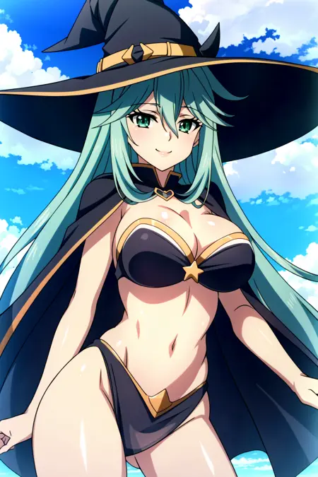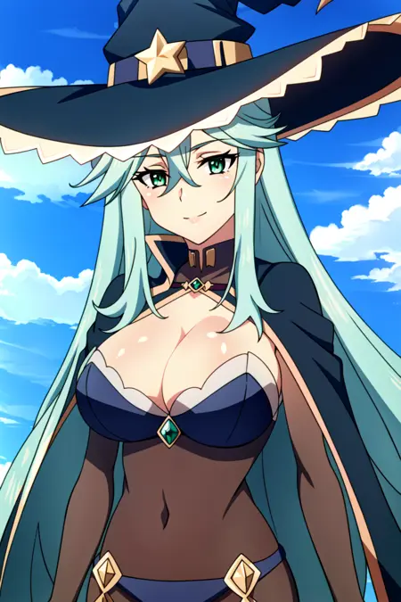 Natsumi Kyouno, 1girl, hat, solo, green hair, long hair, green eyes, witch hat, breasts, cloud, sky, staff, star (symbol), cape, bodysuit, day