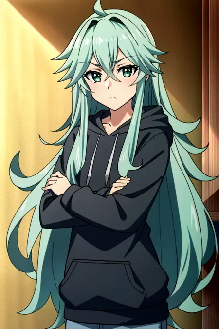 Natsumi Kyouno, 1girl, long hair, solo, green eyes, hoodie, green hair, hood, looking at viewer, hair between eyes, bangs, long sleeves, indoors, frown, very long hair, closed mouth, hood down, black hoodie