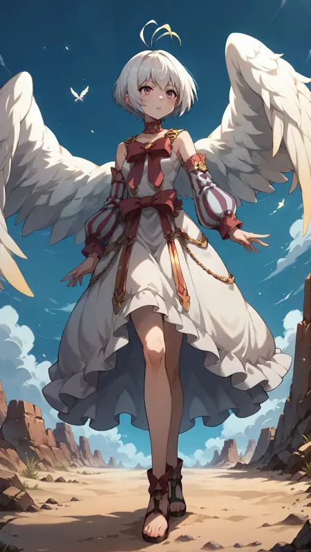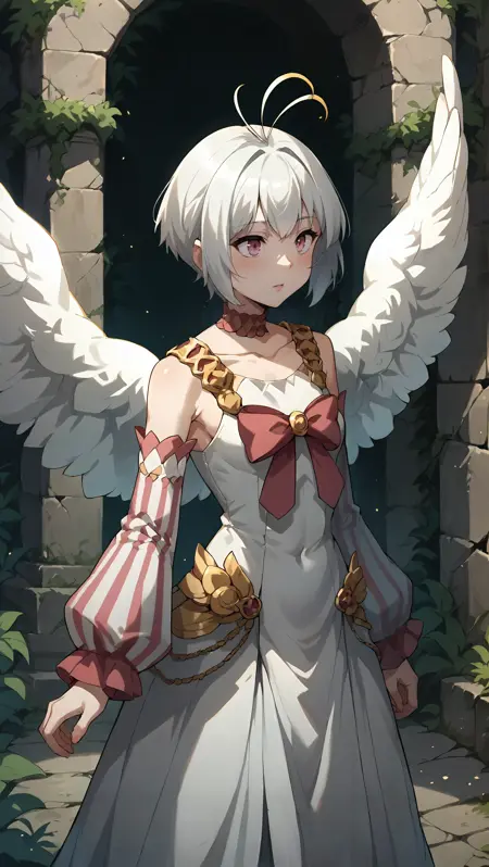 short hair, white hair, antenna hair, ahoge, pink eyes, bare shoulders, long sleeves, white and pink dress, bow, angel wings, frills