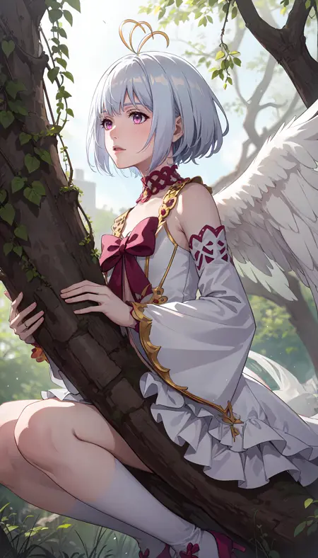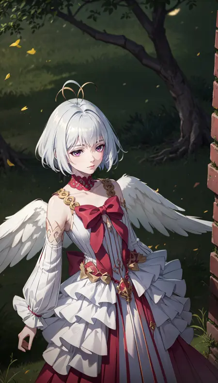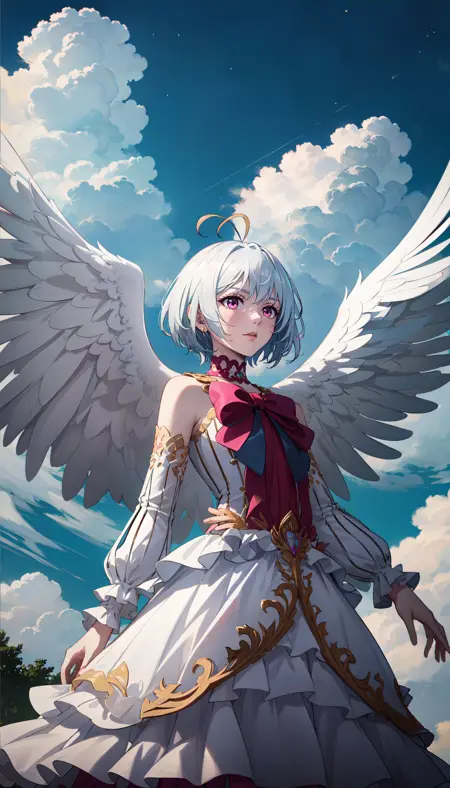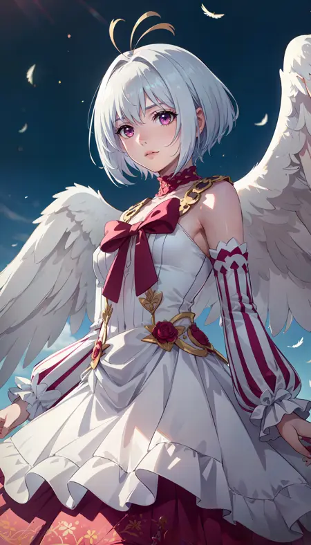 short hair, white hair, antenna hair, ahoge, pink eyes, bare shoulders, long sleeves, white and pink dress, bow, angel wings, frills